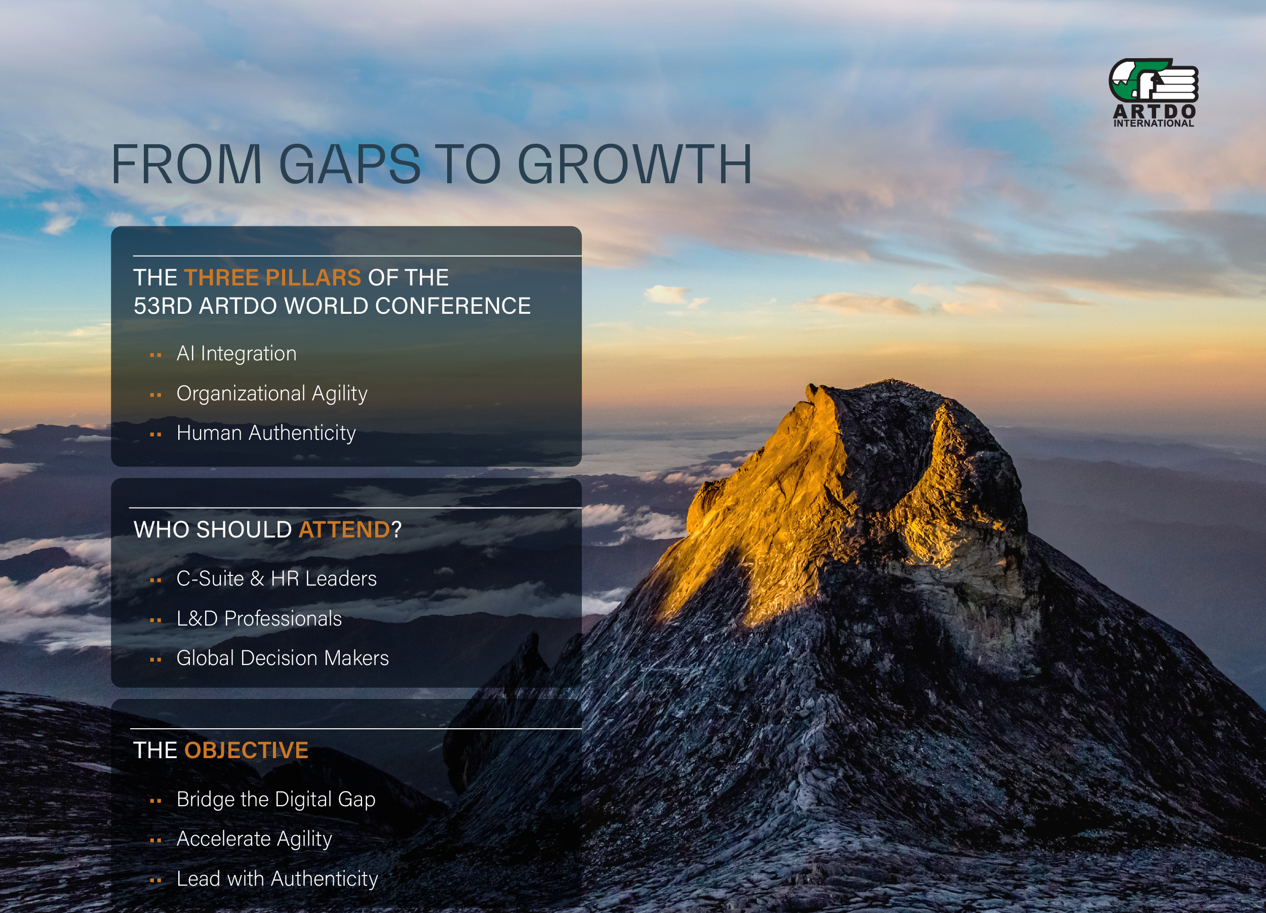 As Chairman Emeritus of ARTDO International, it gives me great pleasure, on behalf of the Board, to warmly welcome you to the 53rd ARTDO International World Conference. For over five decades, I have seen ARTDO International grow into a global catalyst for human capital excellence, bringing together thought leaders, practitioners, and change-makers from across the world. This year, we come together with a renewed purpose, to bridge the 'Gaps to Growth' and explore how we can adapt, innovate, and thrive in an ever-evolving landscape.