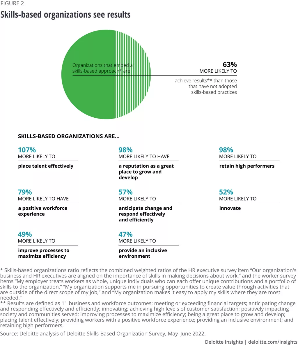 Research from Josh Bersin has indicated that “Dynamic Organizations”—those operating based on skills rather than rigid roles—are 17x more likely to adapt well to change and 3x more likely to exceed financial targets compared to their peers. Similarly, Deloitte found that SBOs are 107% more likely to place talent effectively and 57% more likely to be agile.