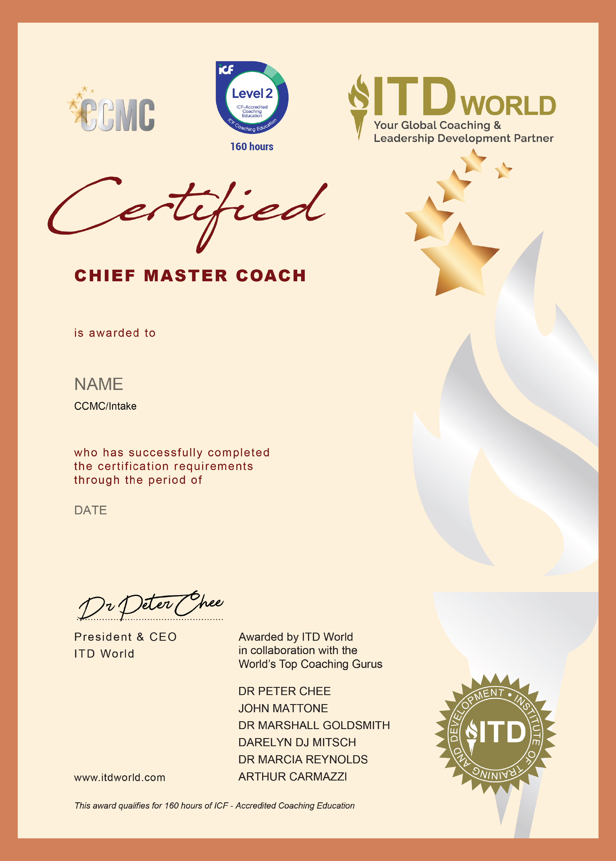 A solid educational foundation in a related area. Many Certified Chief Master Coaches hold advanced degrees. For ITD World’s CCMC program, the ideal candidate should meet two out of the three criteria: